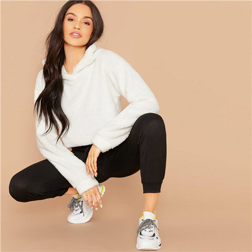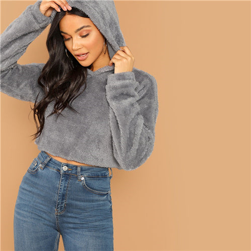 SHEIN Grey Minimalist Solid Drop Shoulder Crop Teddy Hoodie Sweatshirt Autumn Casual Fashion Women Pullovers Sweatshirts